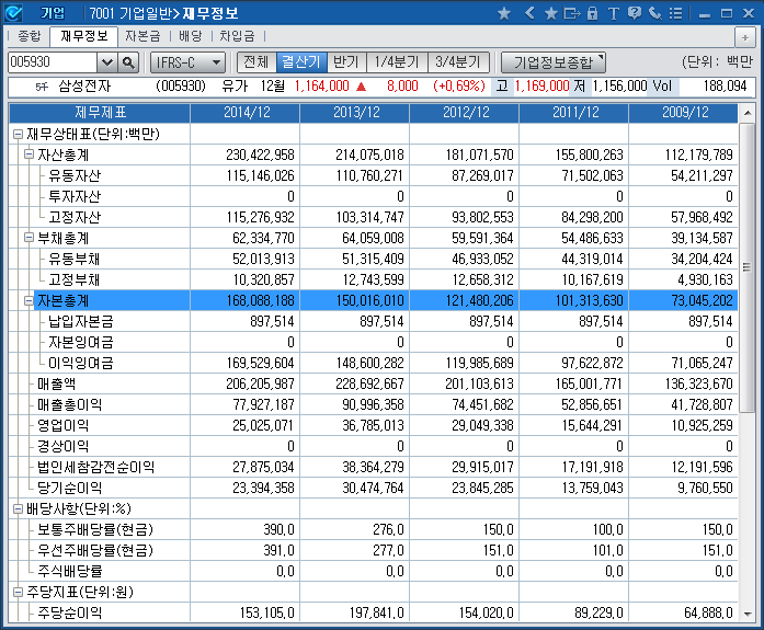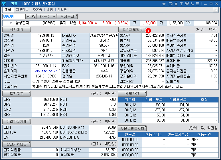 7000번 화면에서 "주요재무정보"를 선택하면 재무제표상의 주요항목들을 정리하여 보여줍니다