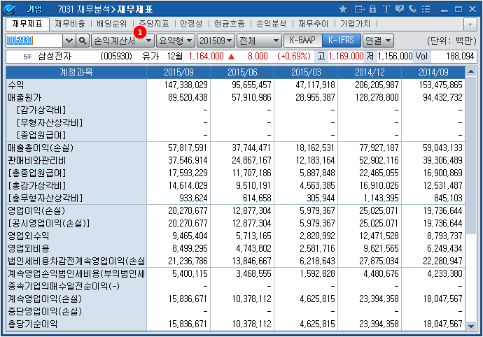 1재무제표를 선택 (대차대조표, 손익계산서, 현금흐름표) 하여 조회할 수 있습니다.
