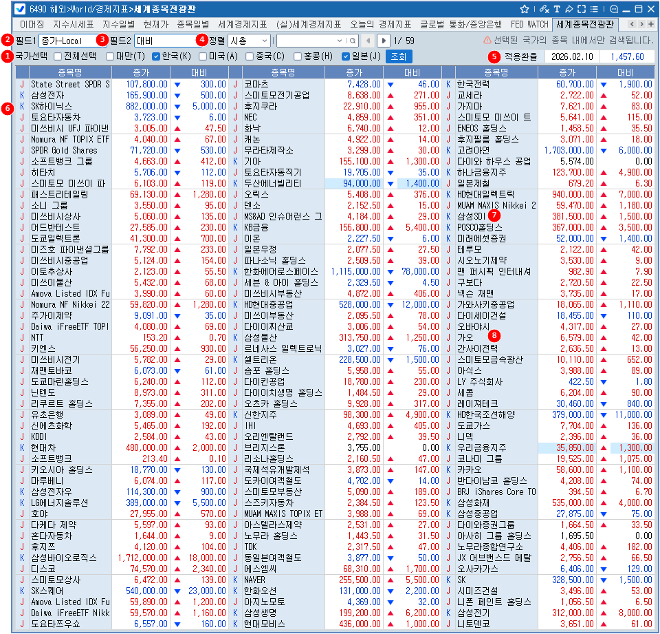 미국, 일본, 홍콩, 중국, 대만, 한국 등 6개국에 상장된 종목의 매매현황을 한눈에 조회할 수 있습니다. 국가별 선택이 가능하며 종가,대비, 등락률, 거래량, 시총 등 다양한 필드를 사용자가 선택 가능하며 정렬 기준도 변경 가능합니다.