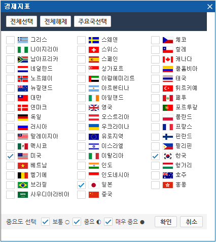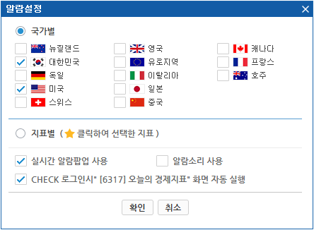2 설정 버튼을 클릭하면 국가별/지표별로 알람설정을 할 수 있습니다.