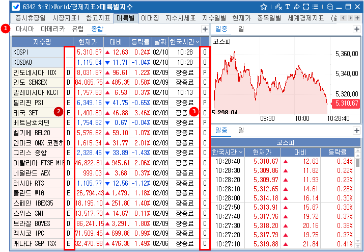대륙별(아시아, 아메리카, 유럽, 종합)로 원하는 지수를 찾을 수 있습니다.