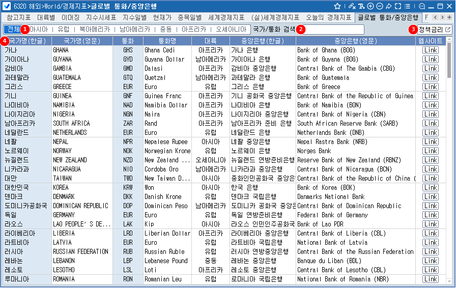 1 대륙을 선택합니다. - 전체, 아시아, 유럽, 북아메리카, 남아메리카, 중동, 아프리카, 오세아니아 2 국가명 및 통화를 키워드로 검색합니다. 3 관련화면 링크를 제공합니다. 3943 국가별정책금리 4 전세계 170개국의 통화 및 중앙은행 정보를 제공합니다. - 국가명(한글/영문), 통화(알파벳 3자리), 통화명, 대륙, 중앙은행명(한글/영문), 중앙은행 웹사이트 링크