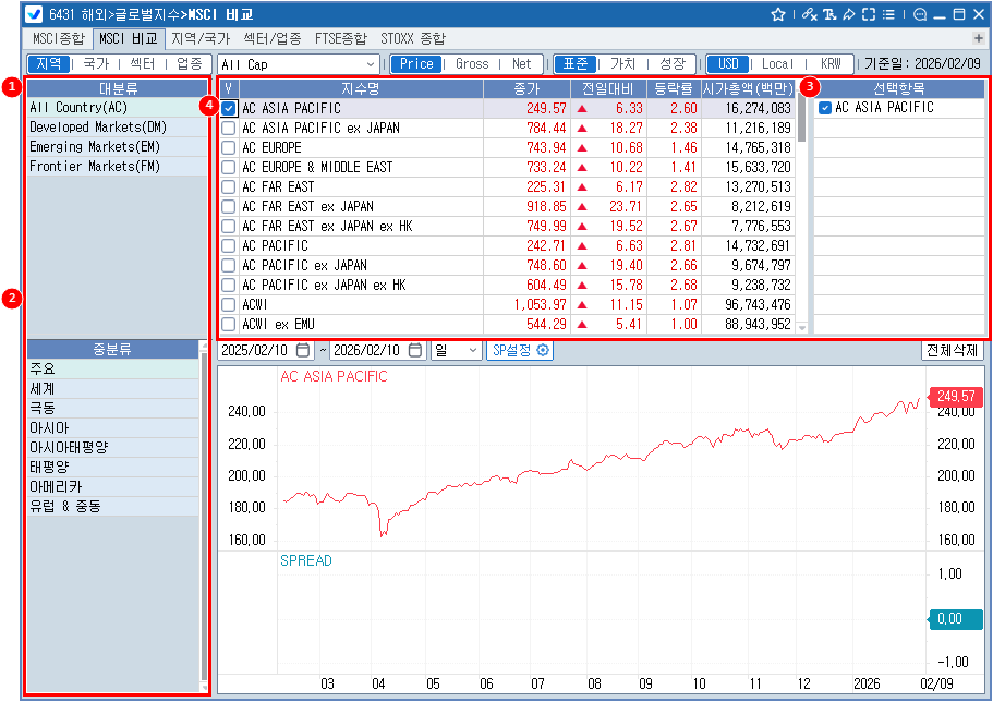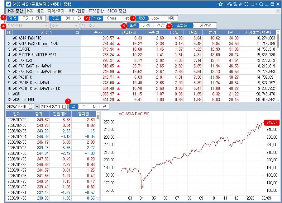 지역별/국가별 MSCI 지수를 조회할 수 있고 Price/Gross/Net 기준에 따른 조회, 통화 종류에 따른 조회 등 다양한 기준에 따른 데이터를 제공합니다.