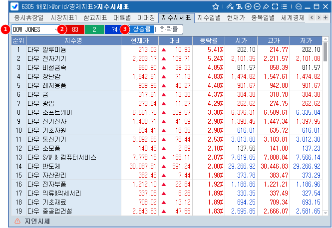산출회사별(또는 거래소별) 그룹 조회가 가능합니다. 다우존스, 모건스탠리 등의 소속그룹별 시세를 제공합니다.