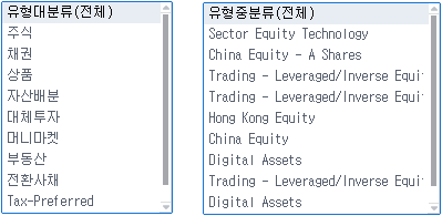 2 총 10개의 유형 대분류를 제공하여 투자 목적에 따른 ETF종류를 필터링할 수 있고 각 국가별 대표적인 운용사순으로 소속된 ETF를 조회할 수 있습니다.
