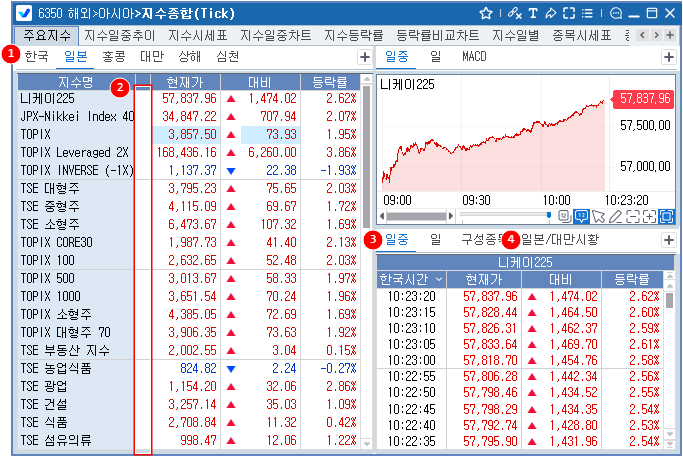 한국, 일본, 홍콩, 대만, 상해, 심천의 주요 지수의 실시간 시세를 제공합니다.