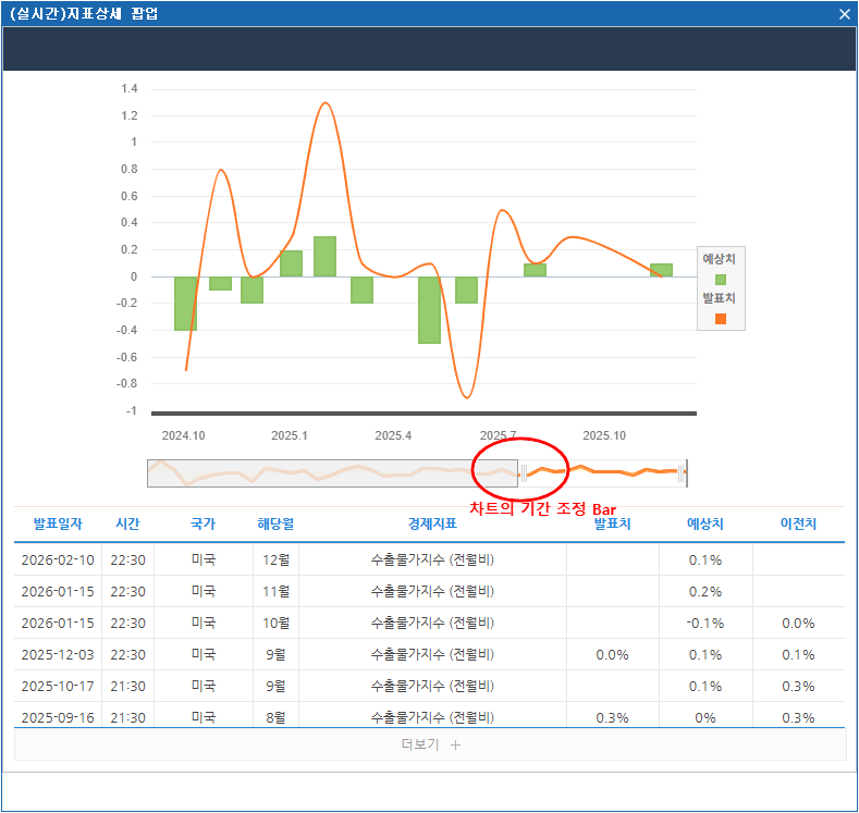 4 경제지표명 또는 차트 아이콘을 클릭하면 상세 히스토리를 차트와 함께 조회할 수 있습니다.