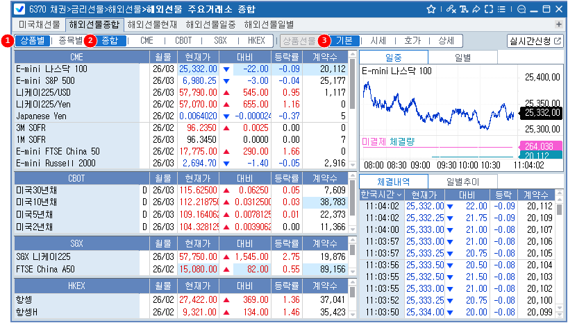 2 상품별 선택 시, 종합/CME/CBOT/SGX/HKEX 중 선택하여 상품군별 분류 조회 가능