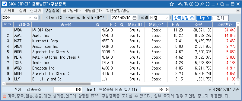 ETF의 구성종목 정보를 Top10까지 제공하며 전체 구성종목수 및 전체 구성종목 수 대비 비중 정보를 제공합니다.