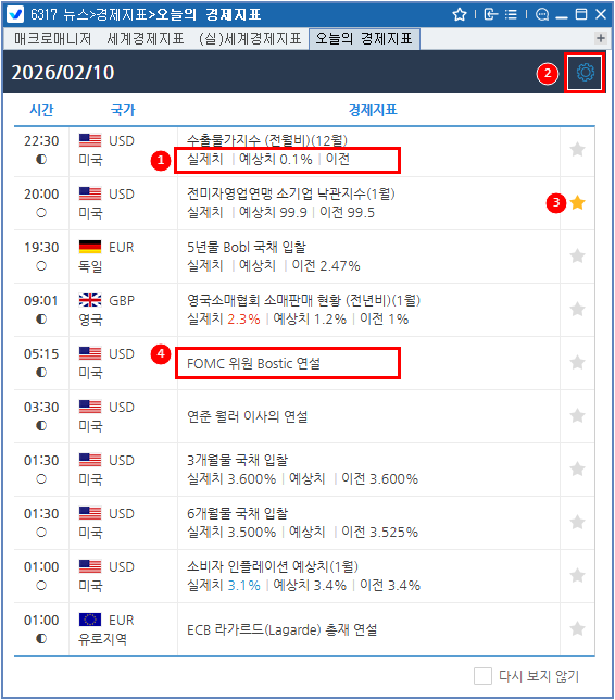 1 실제치, 예상치, 이전치의 값을 보여줍니다. 실제치는 해당값이 발표되었을 때 데이터가 표시됩니다. 예상치 대비 실제치가 상승한 경우는 빨간색, 하락한 경우는 파란색으로 표시합니다.