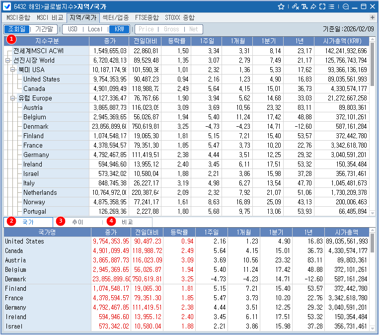 MSCI에서는 USD 및 Local 통화 단위의 값을 제공하고, KRW는 CHECK 단말에서 자체적으로 원화로 환산하여 제공하는 값입니다.