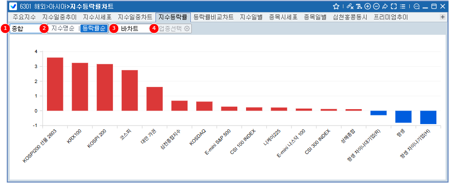 지수명 또는 등락률 순서로 선택하여 차트를 조회할 수 있습니다.