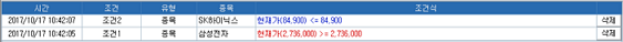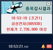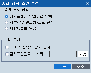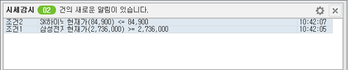 현재가, 전일대비, 등락률, 매수호가, 매도호가 등의 시세 변화가 특정 가격이나 조건에 만족할 때 그 결과를 alert 팝업창이나 알리미 등의 방식으로 알려줍니다.