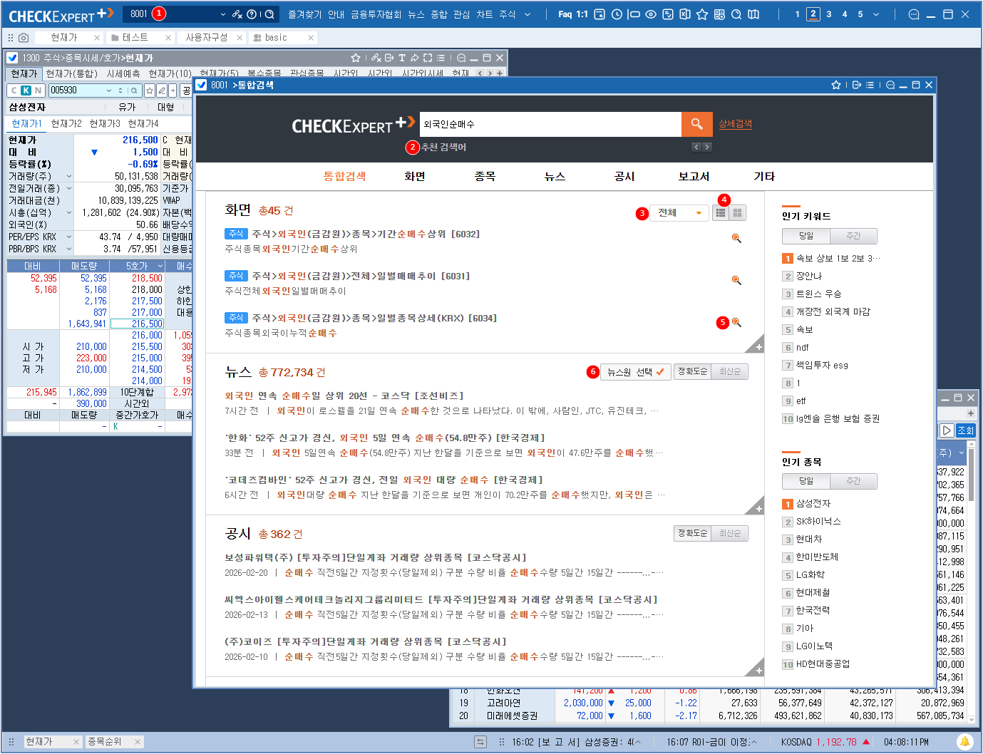 3 검색결과가 많은 경우 전제/종합/주식/ETP/ELW 등 화면 대분류별로 선택하여 조회하실 수 있습니다. 4 화면 검색결과는 목록순/이미지순 2가지 모드로 표시할 수 있습니다. 5 돋보기 버튼을 클릭하면 화면 미리보기가 되고 화면명을 클릭하면 화면이 오픈됩니다.