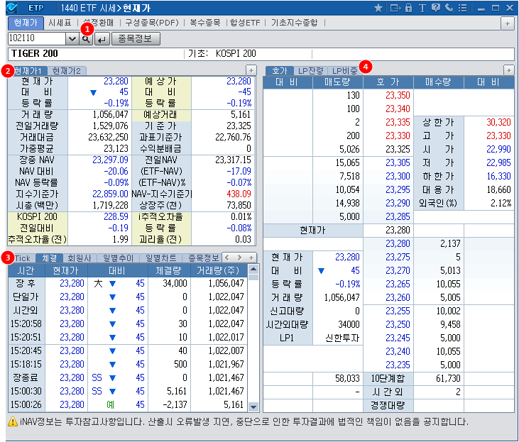 현재가1,2 탭으로 구성되어 있으며, 현재가, 대비, 등락률, 거래량, 거래대금 및 장중NAV(iNAV), 전일NAV, 괴리율 등 종목의 기본적인 정보를 보여줍니다.