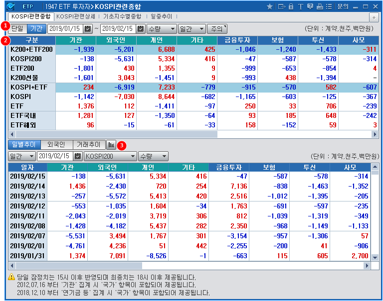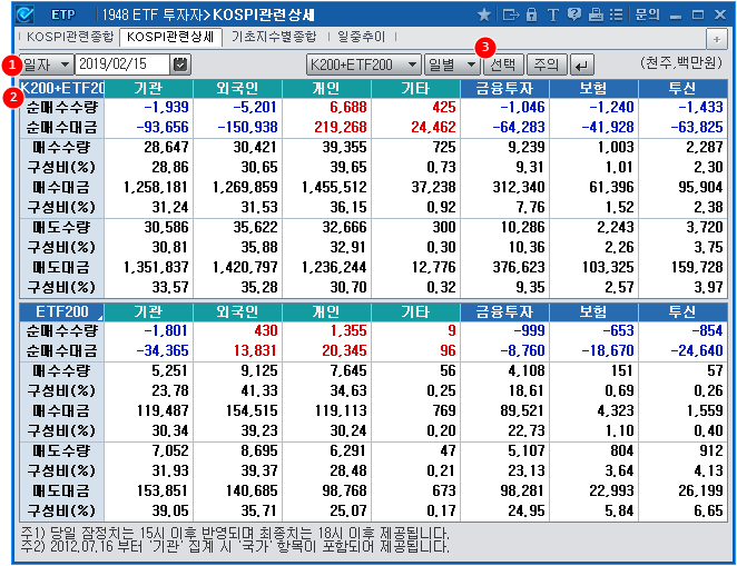KOSPI 및 ETF에 대해 투자자 정보에 대한 상세정보를 제공합니다.
