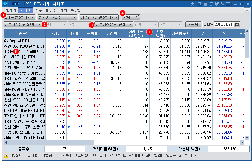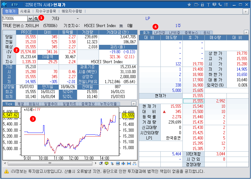 현재가, 대비, 등락률, 거래량, 거래대금 및 장중IV(iIV), 전일IV, 괴리율 등 종목의 기본적인 정보를 보여줍니다.