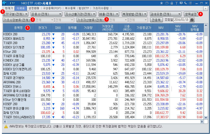 5 ETF 종목명 (다른 화면으로 Drag&Drop 가능)선택된 분류항목에 해당하는 ETF종목은 종목명을 Drag&Drop하여 1440 현재가 화면, 1448 PDF 화면 등으로 자유롭게 이동하여 보다 자세한, 또는 관련된 정보를 연계하여 확인할 수 있습니다.