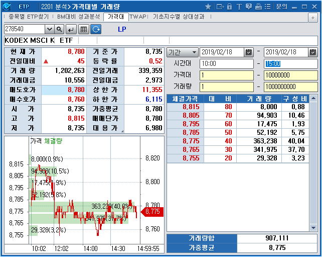 - 2201 (가격대별 거래량) 당일(또는 기간)의 체결가격대별 거래량과 비중을 확인할 수 있습니다.