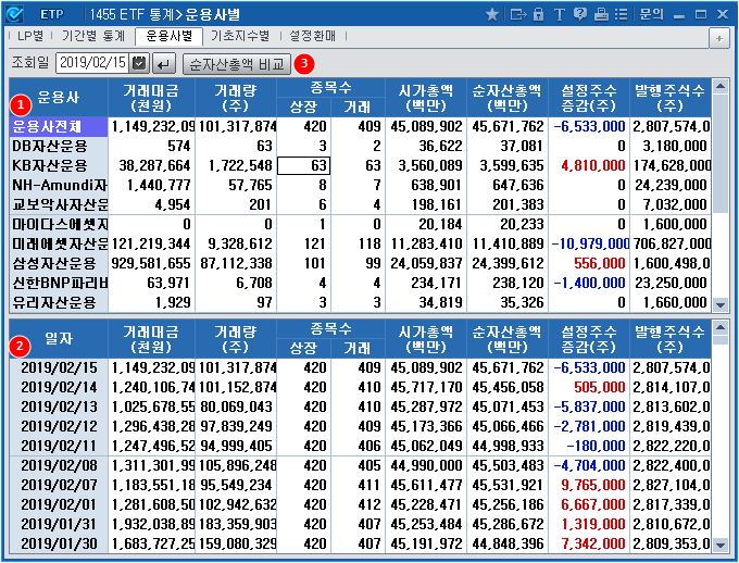운용사별 통계데이터(거래대금, 순자산총액, 주식수 등)를 제공합니다.