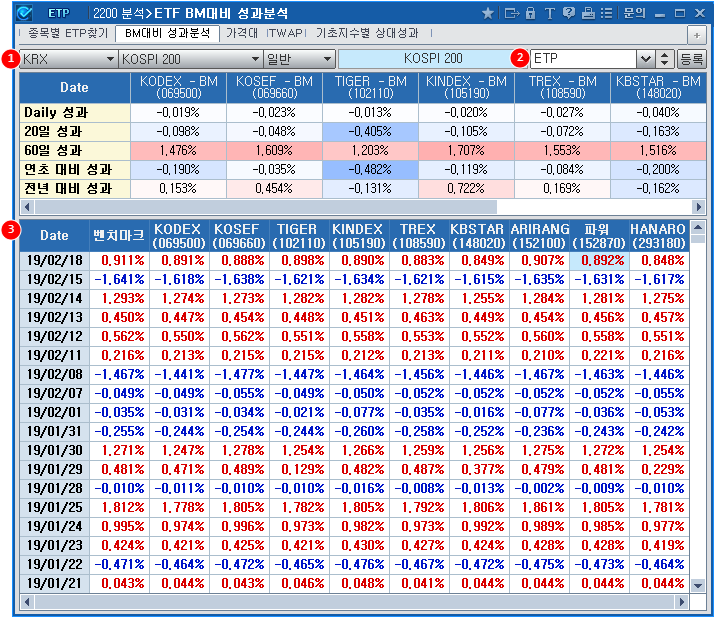 예) KOSPI 200 지수 선택 -> KOSPI200지수 관련 종목들에 대한 절대성과를 히트맵으로 제공, 상대성과(KOSPI200과 수익률 비교) 제공