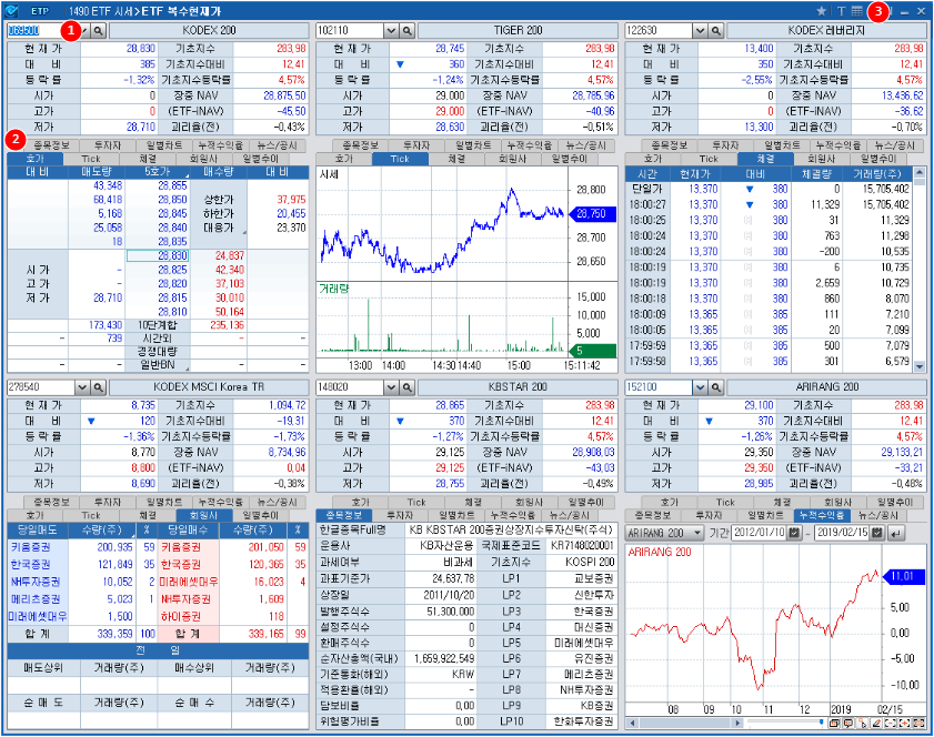 ETF의 현재가 화면으로서, ETF종목의 기본적인 시세성 정보 (현재가, 대비, 등락률) 뿐만 아니라, 체결정보(차트 포함), 일별정보(차트 포함), 기초적인 종목정보 및 관련 뉴스까지 제공하는 ETF의 종합화면입니다.