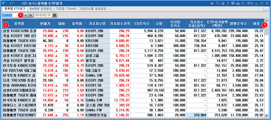 예) 삼성전자로 검색하면 삼성전자를 구성종목으로 하는 ETP 종목 리스트를 보여줍니다.