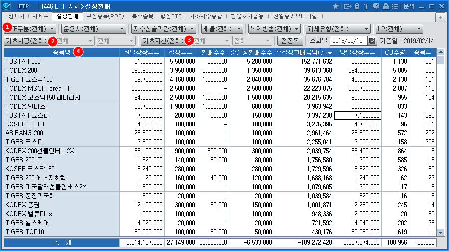 ETF분류별 종목들에 대해 상장주수, 설정/환매 등에 대한 정보를 제공하는 화면입니다.